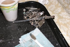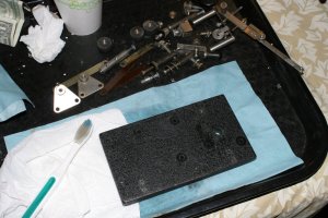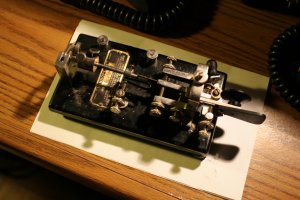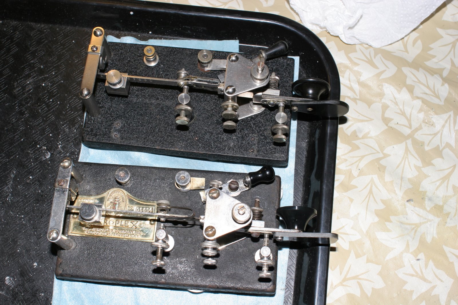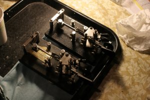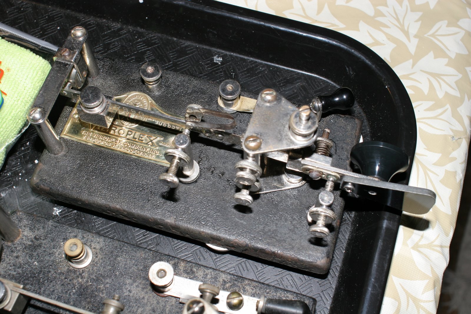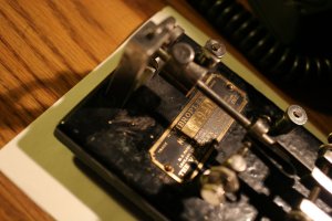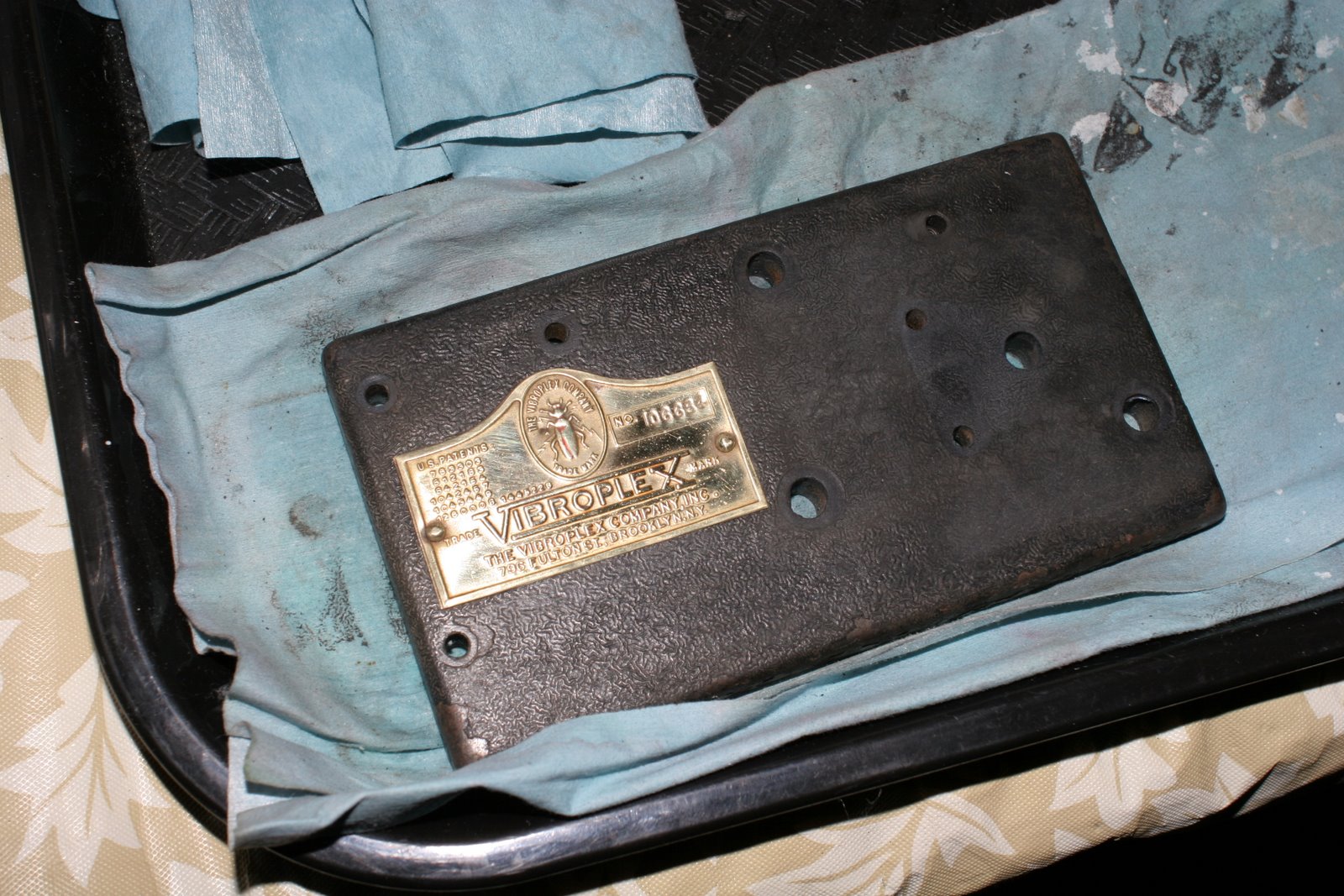toothbrush, few rags and some elbow grease to get it almost completely clean. Unfortunately the previous owner decided it was better to glue strips of rubber on the bottom so when it came time to improvise round rubber feat I had some trouble. That is with the glue left behind, real sticky stuff. I managed to work most of it off but some still remains – I had faced a dilemma: either use harsh chemicals to remove the glue crud and damage the paint underneath or use the brush, water and soap. I opted for the soap and water – it worked ok and I still have the paint(whats left of it) on the bottom of the base. For replacement feat I used white rubber ones found in the Home Depot furniture section(or thereabouts). They’re a little oversized but work and give the bug a much better footing on the table. A side note: when using Brasso, avoid the RED PAINTED bug emblem on the Vibroplex name plate! I ended up Brasso’ing that part too much and pretty much lost most of the red paint on the little bugger.