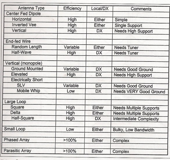 My Fall 2011 issue of QRP Quarterly had a nice summary of different antenna types and their respective efficiencies and best operating types (DX vs. NVIS).