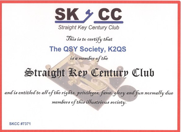 Thanks to Scott, W2NTV for enrolling us as lifetime members of the Straight Key Century Club. We have been assigned #7371. Visit their website to learn more about yet another worldwide organization that does so much to encourage those new to CW with programs such as their “Elmer” program and a host of on-air activities. Our certificate is below:
